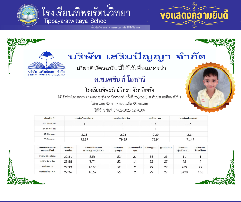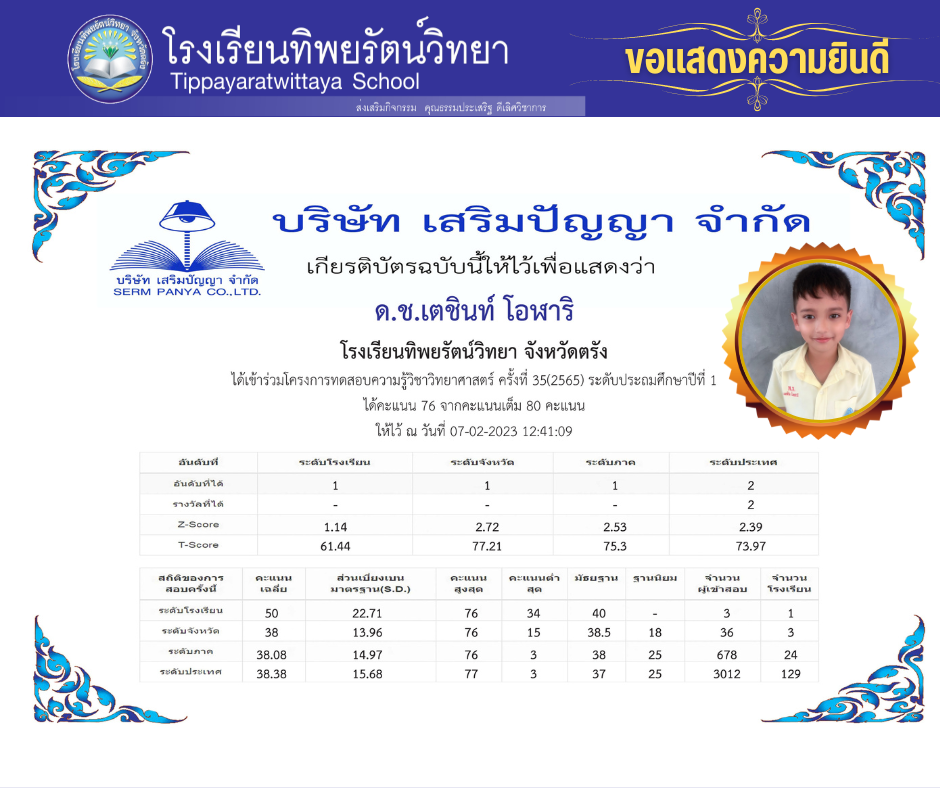 รางวัลและผลงานนักเรียน ขอแสดงความยินดีนักเรียนคนเก่ง ด.ช.เตชินท์ โอฬาริ 07/02/202307/02/2023 admin Post Views: 56