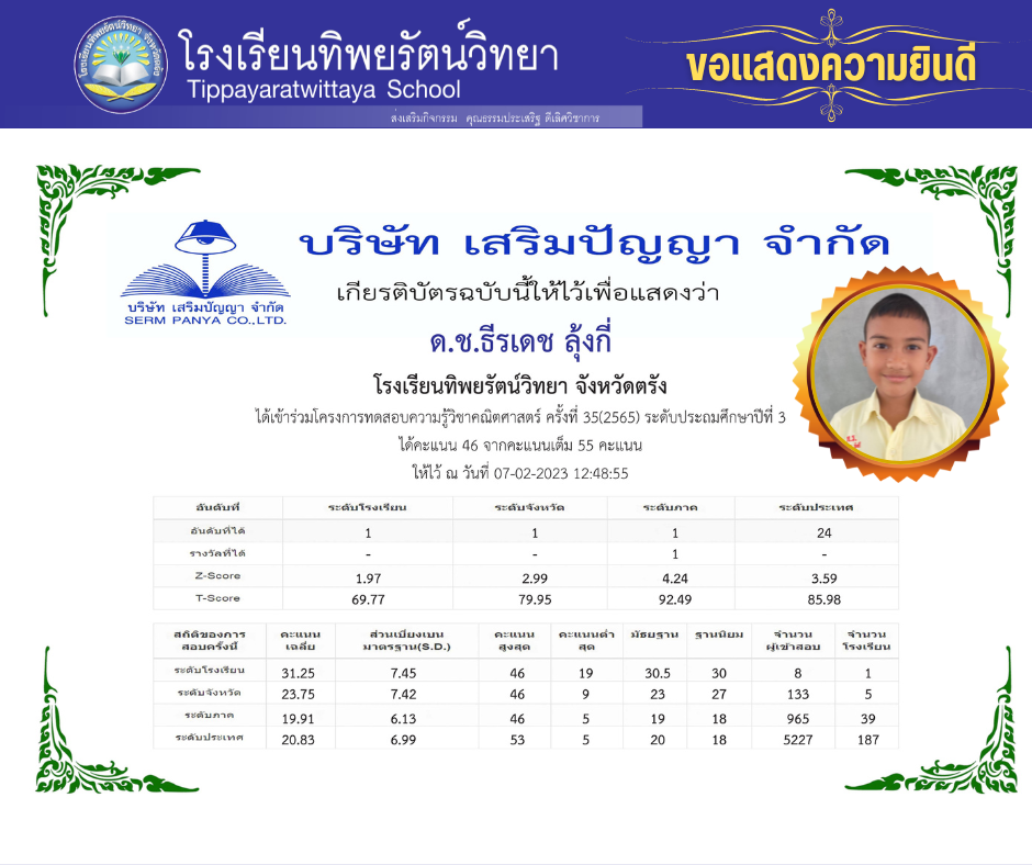 รางวัลและผลงานนักเรียน ขอแสดงความยินดีแก่นักเรียนคนเก่ง ด.ช.ธีรเดช ลุ้งกี่ 07/02/202307/02/2023 admin Post Views: 56