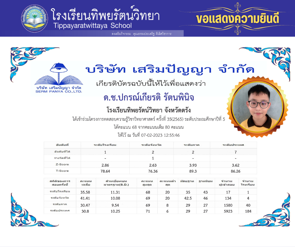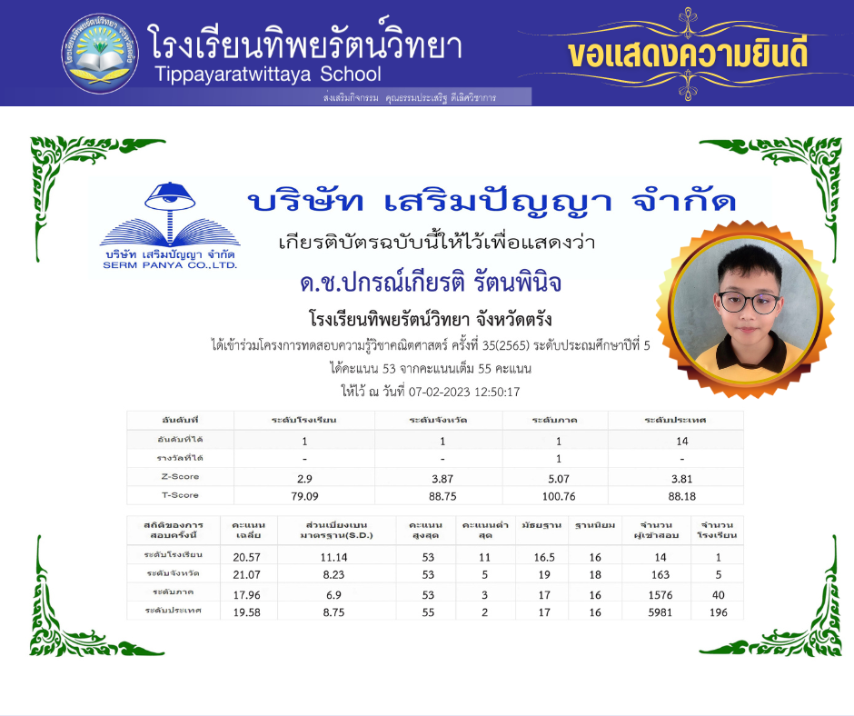 รางวัลและผลงานนักเรียน ขอแสดงความยินดีแก่นักเรียนคนเก่ง ด.ช.ปกรณ์เกียรติ รัตนพินิจ 07/02/2023 admin Post Views: 54